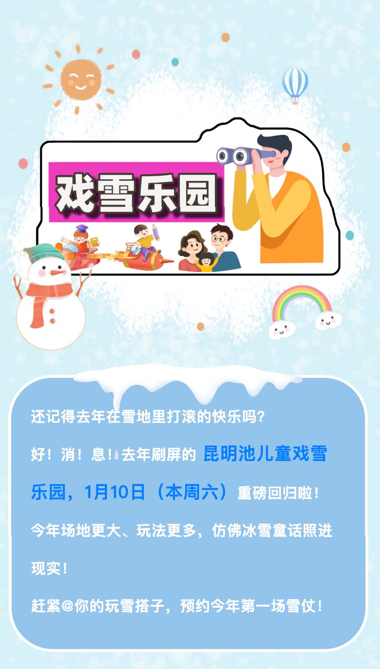 昆明池儿童戏雪乐园1月10日惊喜回归~29元起早...